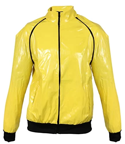 - Includes: Yellow Jacket with Pockets, Yellow Trousers + Sunglasses + Gold plastic chain + Black stick-on goatee