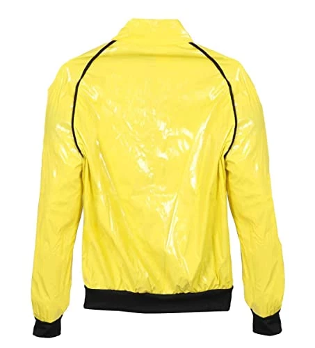 Represent the Westside with our 90s Rapper Fancy Dress Costume for Adults! This fancy dress costume features a shiny yellow jacket with black detailing on the shoulders, hem and cuffs, a large collar and two pockets, a pair of matching yellow trousers with a black waistband and black leg cuffs. This 90s Rapper costume also includes a yellow beanie hat with a black trim, a pair of sunglasses, a long plastic gold chain, as well as a black stick-on goatee.