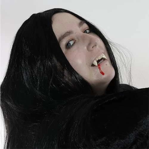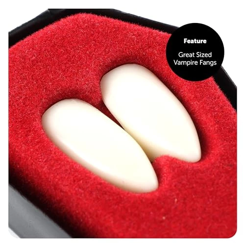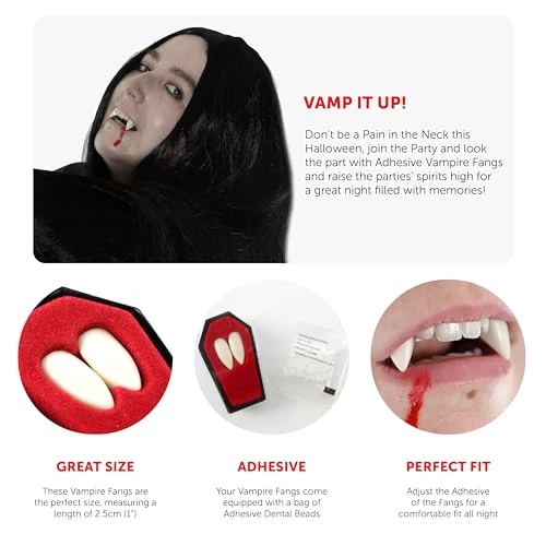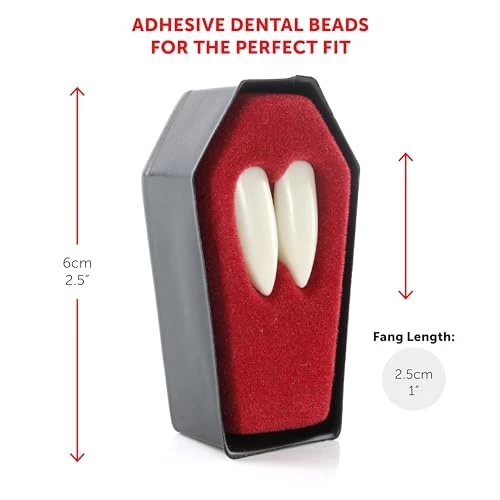 - FANG DETAILS: Your Vampire Fangs are a pair of large White Plastic Fangs that come in a Red Felt Coffin Shaped Box, and include a bag of Dental Adhesive Beads, the perfect addition to your spooky outfits!