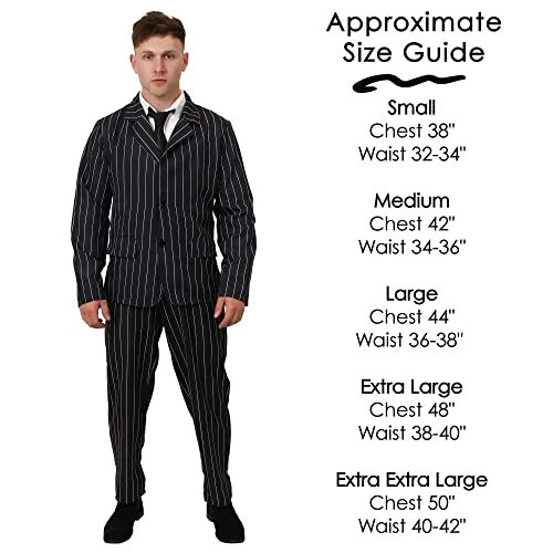 - AVAILABLE IN MULTIPLE SIZES: The Adults Gangster Costume is available in sizes Small to XX-Large: Medium: – Chest: 42”, Waist: 34-36”