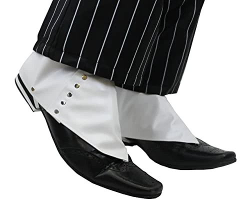 - COSTUME INCLUDES: A Black and White Pinstripe Jacket with padded shoulders and 2 buttons, matching elasticated black and white trousers, Cigar,Inflatable Tommy Gun, Braces, Spats Shoe Covers, Spiv Tash, a Black Fedora Hat with White band, and a black tie to complete the look!