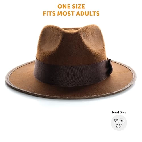 - ONE SIZE FITS MOST: The Brown Fedora Hat is one size making it suitable for most Adults to wear comfortably, with a Head Size measuring up to 58cm (23″) GREAT SIZED ACCESSORY: The Claw Hand Glove is one size with an adjustable design, making it suitable for most Adults to wear comfortably! Each of the plastic Claws measure an approximate length of 7.5cm (3″) from the fingertip!