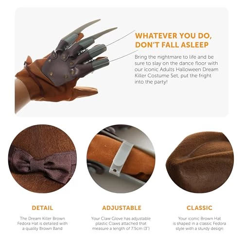 - COSTUME INCLUDES: Your Adults Dream Killer Costume Set includes a sturdy Brown Fedora Hat with an attached decorative bow, and a Brown Claw Hand Glove with plastic Claws attached to each fingertip with comfortable adjustments to fit your fingers comfortably, the perfect Costume for this years Halloween party!