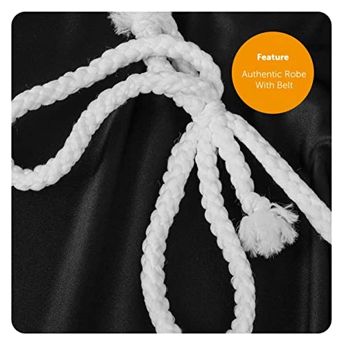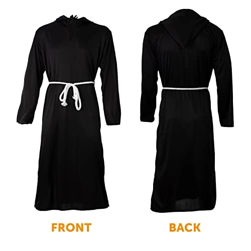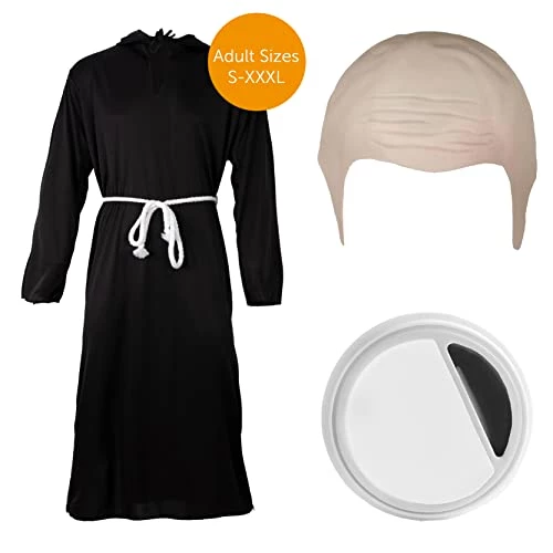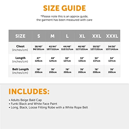 - INCLUDES: LONG BLACK ROBE WITH WHITE ROPE BELT + BALD CAP + BLACK & WHITE FACEPAINT