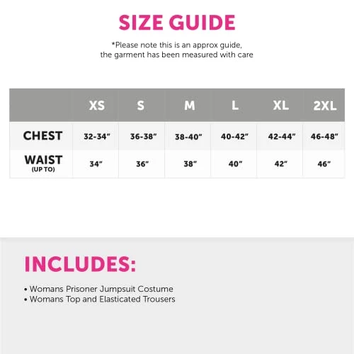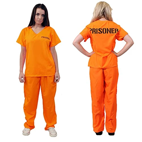 - COSTUME INCLUDES: This Ladies Prisoner Costume includes an Orange Prisoner Convict Top with ‘PRISONER’ print on front and back, and with matching Orange Trousers with an Elasticated Waistband!