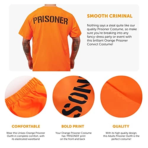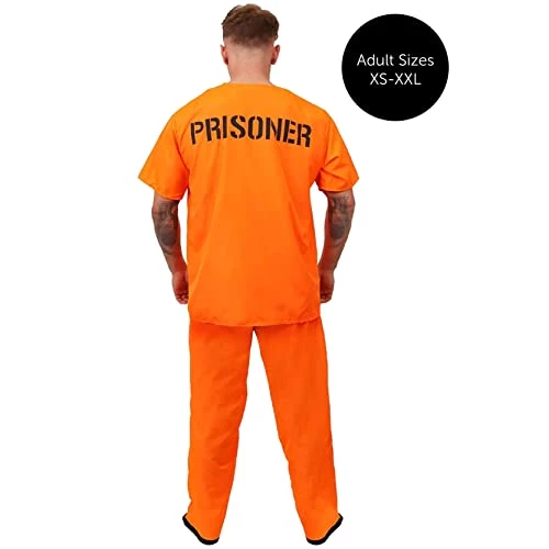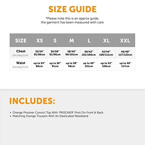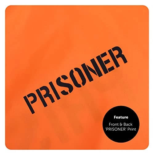 - COSTUME INCLUDES: This Adults Prisoner Costume includes an Orange Prisoner Convict Top with ‘PRISONER’ print on front and back, and with matching Orange Trousers with an Elasticated Waistband!