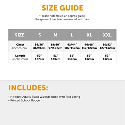 - AVAILABLE IN MULTIPLE SIZES: Your Adults Wizard Robe is available in multiple sizes from Small to XX-Large: XX-Large – Chest – 50-52″/127-132cm, Length – 52″/132cm