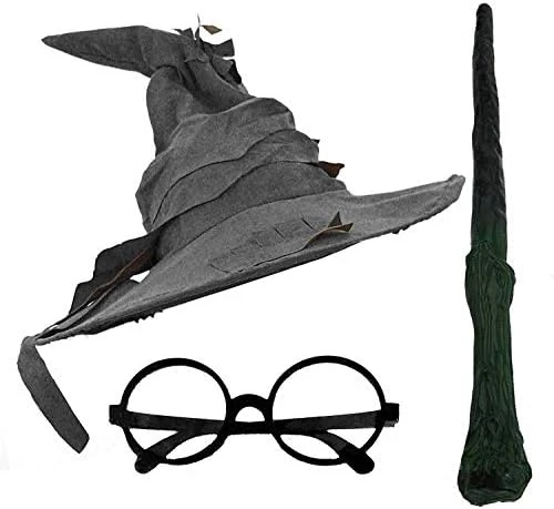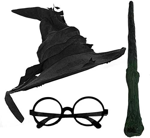 THE WIZARD FANCY DRESS COSTUME ACCESSORY SET INCLUDES: A SUEDE-LOOK POINTED WIZARDS HAT WITH TATTERED DETAILING AND A WIRE FOR STYLING PURPOSES. THE WIZARD HAT IS AVAILABLE IN A SINGLE SIZE AND IS VERY FLEXIBLE, SO IT WILL FIT MOST ADULT HEAD SIZES. THE FANCY DRESS ACCESSORY SET ALSO INCLUDES A PAIR OF ROUND GLASSES WITH THICK BLACK FRAMES AND CLEAR LENSES, WHICH IS AVAILABLE IN A SINGLE SIZE THAT WILL FIT MOST AND A GREY BRANCH-STYLE WIZARD’S WAND WITH FLECKS OF GREEN, WHICH MEASURES 13 INCHES (34 CM) IN LENGTH.