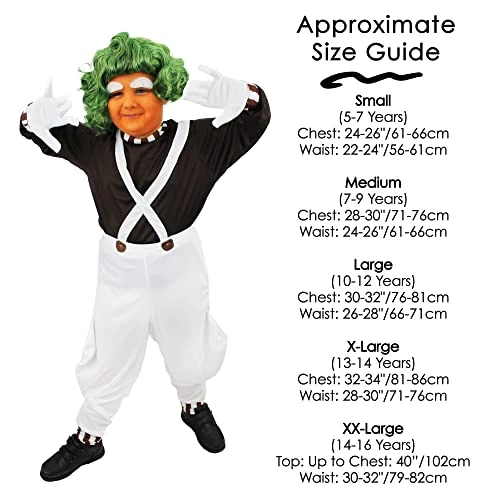 - COSTUME SET INCLUDES: This amazing Fancy Dress costume set includes: Brown Long-Sleeved Top with Striped Collar and Cuffs, White Dungarees with Crossed Straps, Childs White Gloves, Childs Green Factory Worker Wig and Orange Face paint!
