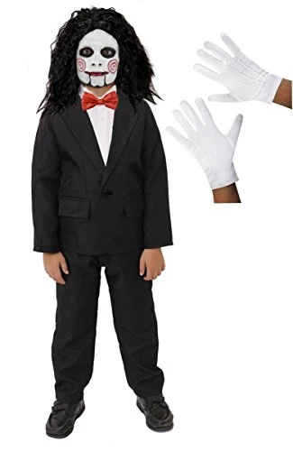 CHILDS EVIL PUPPET FANCY DRESS COSTUME – CHILD HALLOWEEN COSTUME – BLACK SUIT, RED BOW TIE, FACEPAINT, WIG AND GLOVES – PERFECT FOR MOVIE THEMED FANCY DRESS