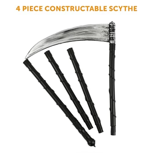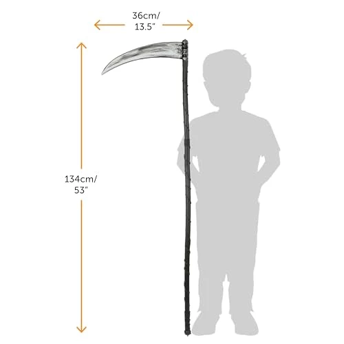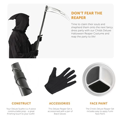 - REAPER COSTUME DETAILS: Your Child Reaper Costume includes a Black Ragged Reaper Robe with a Separate Matching Black Hood, A 53 Inch (134 cm) Long Plastic Scythe and Black Gloves