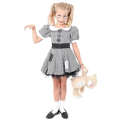 Girls Creepy Doll Fancy Dress Costume – Black and White Checked Dress With Frayed Hem and Patches – Scary Halloween Broken Ragdoll China Doll Costume