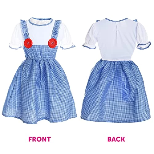 - COSTUME INCLUDES: Our Kansas Girl Costume includes A Blue and White Gingham Pinafore Dress with Faux White T-Shirt Design, with a Large Red Plastic Buttons Detailing on the straps and Matching Gingham Hair Ties!