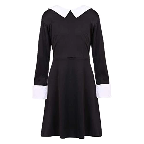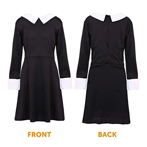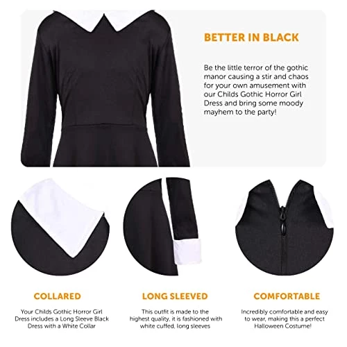 - COSTUME DETAILS: Your Childs Gothic Horror Girl Dress includes a Long Sleeve Black Dress with a White Collar and Sleeves, and a zip up black to slip in and out of the dress whenever you want!