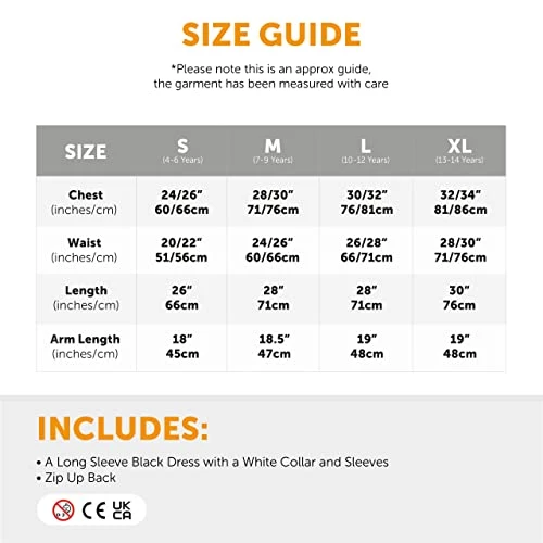 - AVAILABLE IN MULTIPLE SIZES: Your Childs Gothic Horror Girl Dress is available in multiple sizes from Small to X-Large: Small – 4-6 Years – 24/26″ Chest, 20/22″ Waist, 26″ Length, 18″ Arm Length | Medium – 7-9 Years – 28/30″ Chest, 24/26″ Waist, 28″ Length, 18.5″ Arm Length | Large – 10-12 Years – 30/32″ Chest, 26/28″ Waist, 28″ Length, 19″ Arm Length | X-Large – 13-14 Years – 32/34″ Chest, 28/30″ Waist, 30″ Length, 19″ Arm Length
