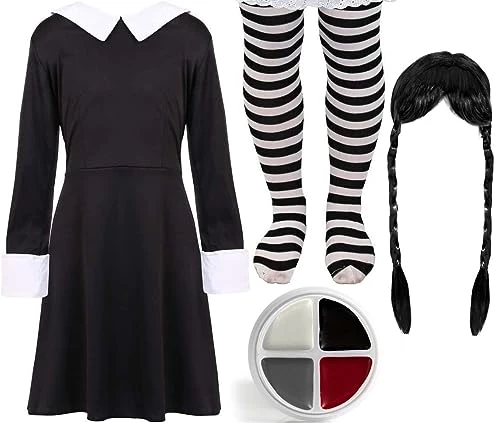 - COSTUME DETAILS: Your Childs Gothic Horror Girl Costume includes a Long Sleeve Black Dress with a White Collar and Sleeves, a Pair of Black & White Striped Tights, a Black Plait Wig and a Pot of Black, White & Grey Facepaint