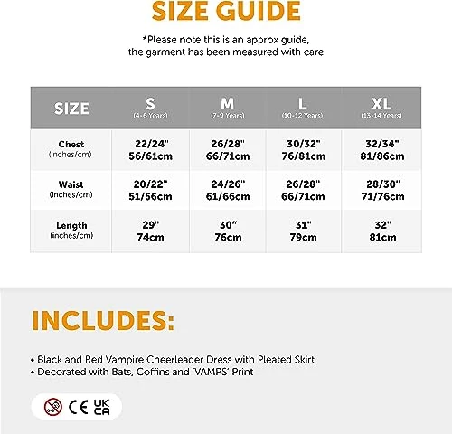 - AVAILABLE IN MULTIPLE SIZES: Your Girls Vampire Cheerleader Costume is available in multiple sizes: Small UK 6-8 – Chest: 80cm (31”) – Length: 75cm (30”)