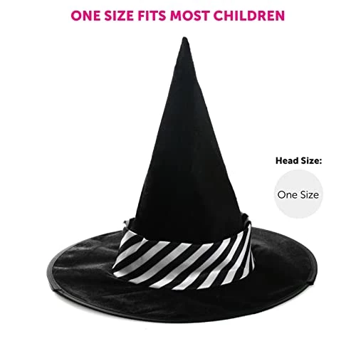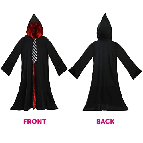 - COSTUME INCLUDES: To be the best, your Child’s Witch costume includes Black Hooded Robe with Red Lining with emblem crest, Black Witch Hat with Striped Band, and a Black and White Striped Tie to complete the look!
