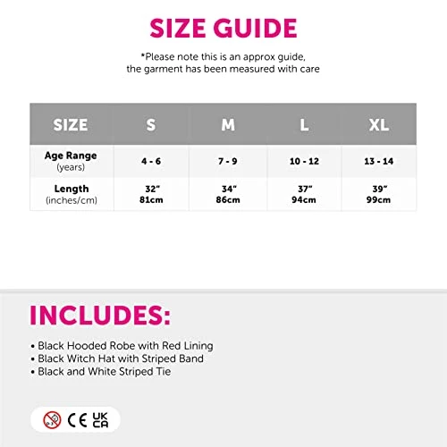 - AVAILABLE IN MULTIPLE SIZES: Our Amazing Child’s Witch Costumes are available for your children in multiple sizes, ranging from Small to X-Large: Small (4-6 Years) – Length: 32″/81cm | Medium (7-9 Years) – Length: 34″/86cm | Large (10-12 Years) – Length: 37″/94cm | X-Large (13-14 Years) – Length: 39″/99cm
