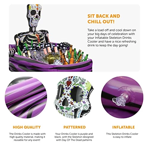 - PERFECT FOR DAY OF THE DEAD AND HALLOWEEN EVENTS: Whether you’re enjoying a Day of the Dead festival or a Halloween Party with friends, pull out a cold one with your Inflatable Skeleton Drinks Cooler and enjoy the days and nights!