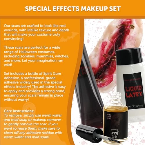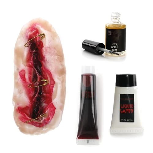 - SET INCLUDES: This Un-Safety Pin Scar Set includes a Fake 3D Scar with Gold Safety Pins attached, a 13ml Bottle of clear adhesive Spirit Gum with a small brush attached to the inside of the lid, a Bottle of Liquid Latex and a Tube of Fake Blood, perfect to finish off your look!