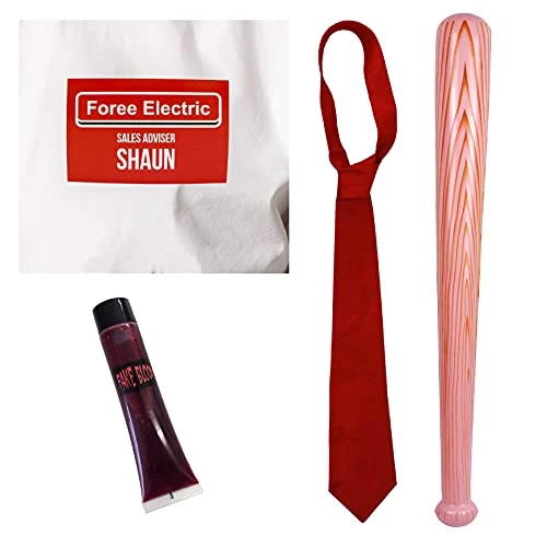 ADULTS SHAUN ??? COSTUME – INFLATABLE BASEBALL BAT + RED TIE + NAME TAG STICKER + FAKE BLOOD – MENS WOMENS TV FILM CHARACTER HALLOWEEN COSTUME