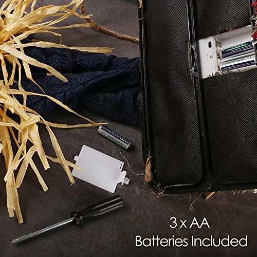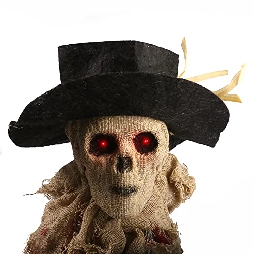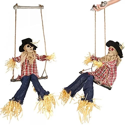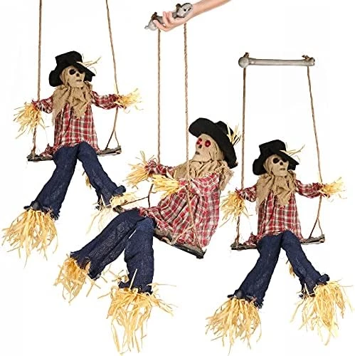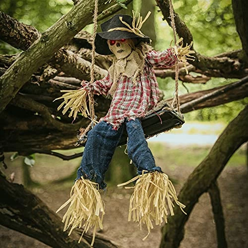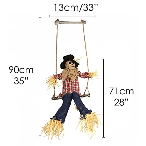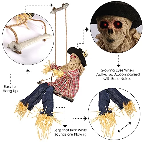 - MOVING LEGS – When activated, the Scarecrow will kick its legs while making noises. You can hang this creepy spectre to a door, Tree branch or hook etc with the bone shaped bar and let visitors enjoys the spooky prop.