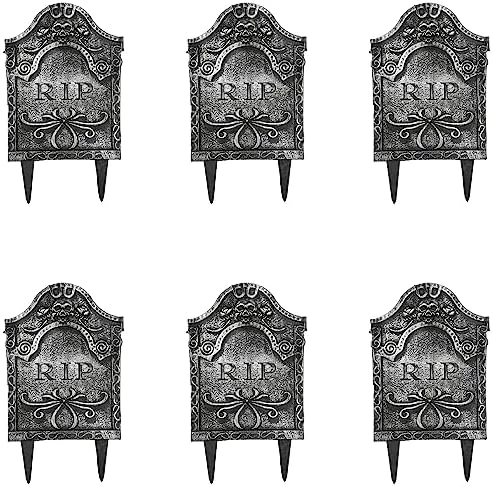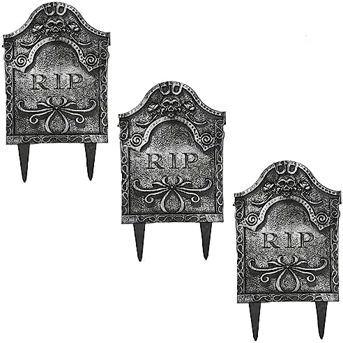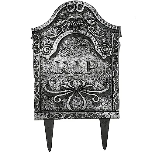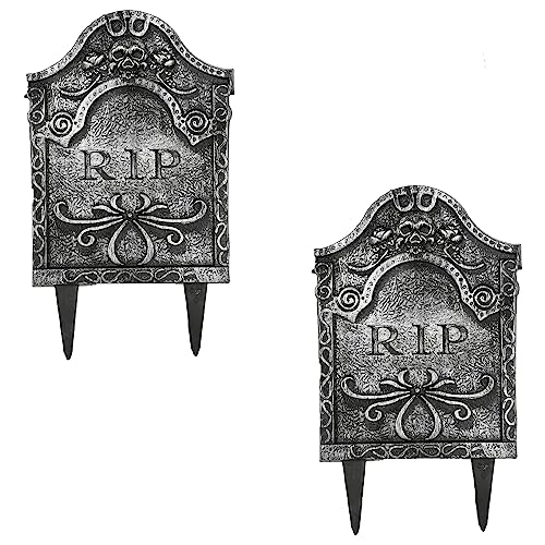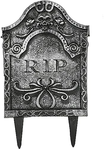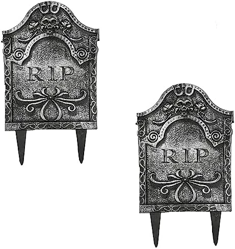 - INCLUDES: 2X GREY PLASTIC TOMBSTONE WITH “RIP” TEXT AND TWO STAKES FOR PLANTING THE PROP IN THE GROUND