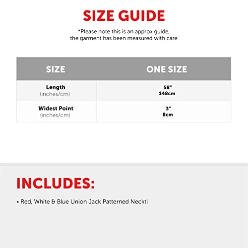 - ONE SIZE FITS ALL: Being a perfect size for any Adult or Child to wear comfortably and easily, these Union Jack Neckties are one size fits all, measuring 148cm (58″) in length and 8cm (3″) in width at the widest point, perfect for any British-themed occasion!