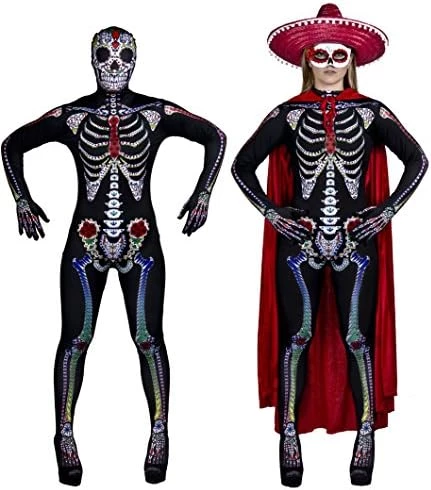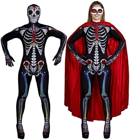 - INCLUDES: ALL IN ONE ZIP UP BACK SUGAR SKELETON SKIN SUIT WITH HIDEABLE MASK + DELUXE VELOUR HOODED RED CAPE + HAND PAINTED SUGAR SKULL MASQUERADE MASK + RED SOMBRERO WITH WHITE POM POMS