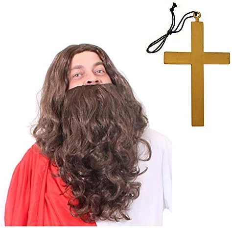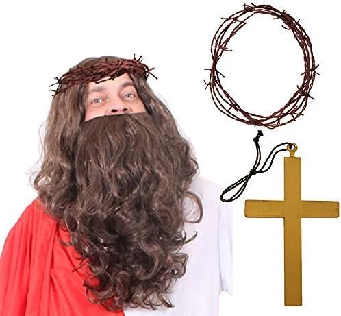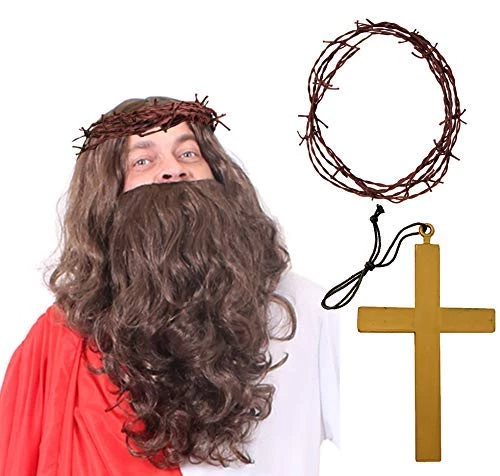 - INCLUDES: LONG WAVY BROWN HAIR WIG WITH MATCHING THICK BROWN BEARD, COMFORTABLE CROWN OF THORNS & GOLD COLOURED PLASTIC CROSS