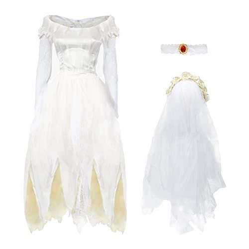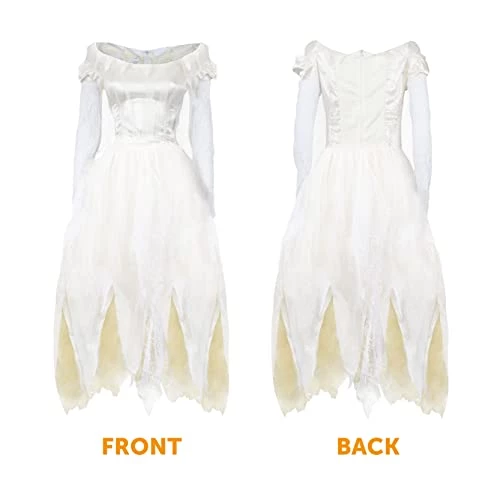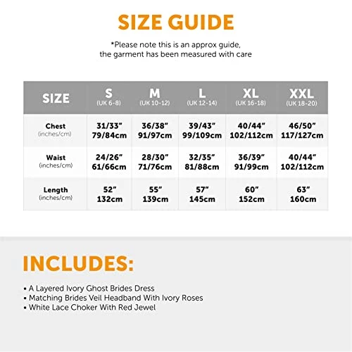 - AVAILABLE IN MULTIPLE SIZES: Your Ladies Ivory White Corpse Bride Halloween Costume is available in multiple sizes from Small to XX-Large: Small (UK 6-8) – Chest: 31-33″/79-84cm, Waist: 24-26″/61-66cm, Length: 52″/132cm
