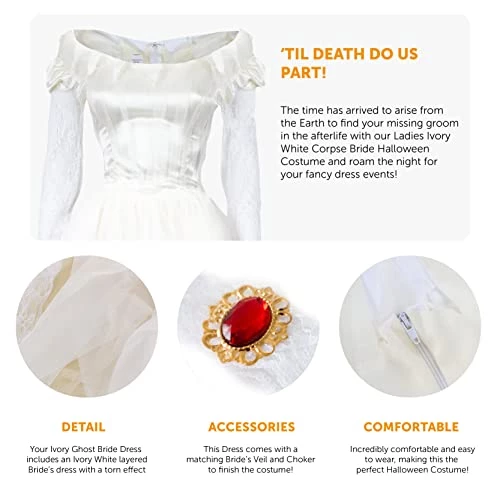 - PERFECT FOR HALLOWEEN AND GOTHIC FANCY DRESS: Whether your prowl the night, marauding for your long-lost groom on Halloween, or need a perfect look for a Gothic fancy dress, then our Ladies Ivory White Corpse Bride Costume is just what you need!