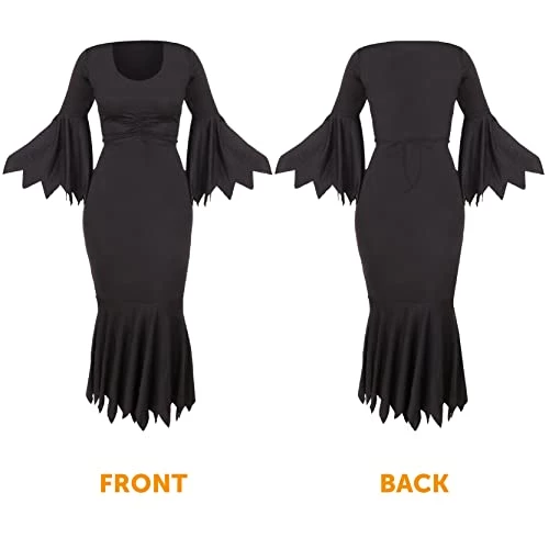 - COSTUME DETAILS: Your Ladies Gothic Halloween Dress is a long Black Dress with tattered edges and a zip-up back of the dress, to make it very easy to slip in and out of the costume, this dress needs little to complete the grand feel!