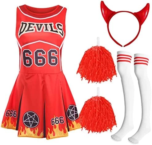 - LADIES DEVIL CHEERLEADER DETAILS: Your Devil Cheerleader Costume includes a Red and Black Dress with Pleated Skirt Decorated with Flames and “DEVILS” Print on Top, a Pair of Red Pompoms, a Pair of Red Devil Horns on a Headband and a Pair of Long White & Red Sports Socks!