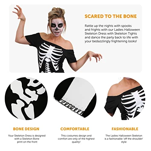 - COSTUME DETAILS: Your Ladies Skeleton Halloween Dress is an ‘Off the shoulder’ skater dress design, with a Skeleton Bone design print on the front with a skirt that is just below the waistline Also Black Tights With Skeleton Bone Design Print On The Front!
