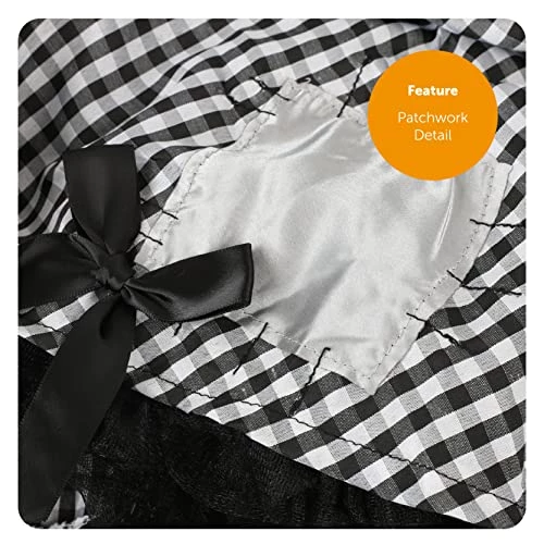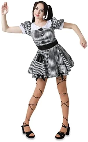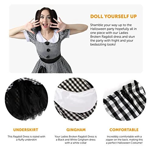 - BROKEN DOLL DRESS DETAILS: Your Ladies Broken Ragdoll Dress is a Black and White Gingham dress with a fluffy underskirt, a white collar attached to the dress, and black patches, black buttons, and a zipper on the back to wear comfortably and easily!