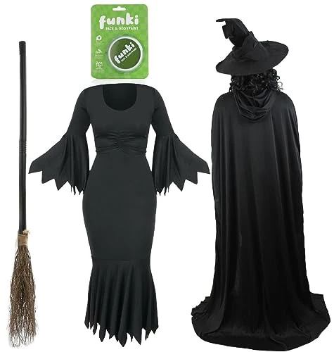 - LADIES WITCH COSTUME DETAILS: Your Ladies Witch Costume includes a black fitted woman’s dress with jagged edge sleeves, a Matching black Cape, Witch’s Hat with a broomstick To Fly Away On, Plus Green Face and Body Paint To Really Complete Your Look.