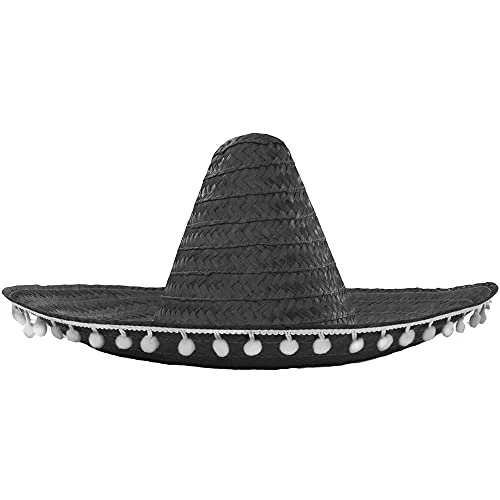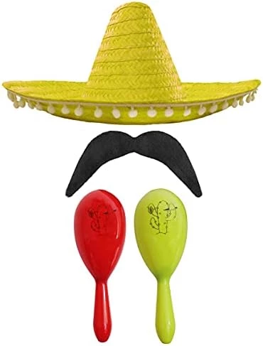 MEXICAN FANCY DRESS ACCESSORY SET – MEXICAN SOMBRERO WITH MARACAS AND TASH BLACK POM POM SOMBRERO + 2X RED MARACAS