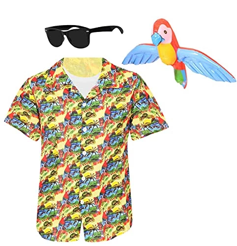 ADULTS 90’S COMEDY DETECTIVE FANCY DRESS COSTUME ACCESSORY YELLOW HAWAIIAN SHIRT + WHITE T-SHIRT + SUNGLASSES + INFLATABLE PARROT