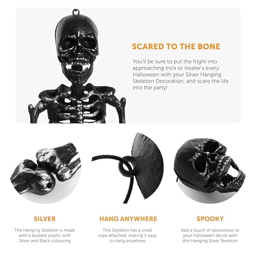 - SKELETON DETAILS: Your Hanging Skeleton Decoration is a Silver Skeleton with an easy hanging design, the Skeleton’s arms and legs have flexible joints allowing it to wriggle around as the decoration hangs to create a spooky Halloween display for your celebrations!