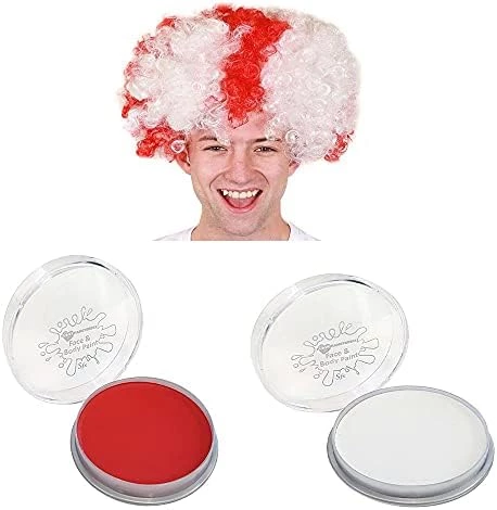 ST GEORGES DAY FANCY DRESS COSTUME SET. CHOOSE FROM EITHER AN ST GEORGE AFRO WIG OR BOB WIG. GREAT FOR BOTH MEN AND WOMENS SUPPORTER FANCY DRESS. GREAT FOR BOTH MEN AND WOMENS SUPPORTER FANCY DRESS. ALSO INCLUDES A POT OF WHITE FACEPAINT & POT OF RED FACEPAINT