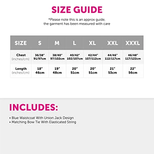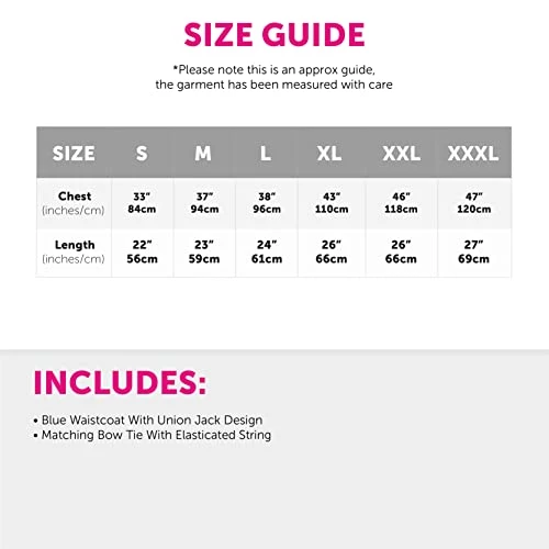 - COSTUME INCLUDES: Your Adults Union Jack Waistcoat set will include a stylish Union Jack Waistcoat with button detail, as well as a matching Union Jack Bow Tie for any British event!