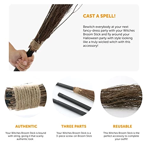 - WITCH BROOM STICK DETAILS: Your Witches Broom Stick is a 3-piece screw-on Broom Stick, containing 2 black handles and a Broom Stick end for you to deconstruct and rebuild whenever you’re feeling Wicked!